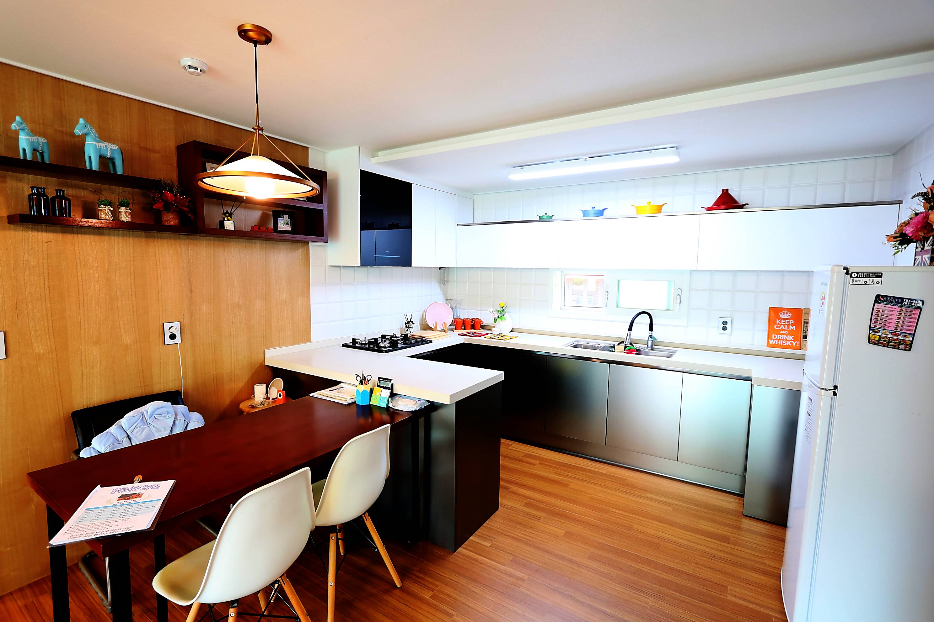 아일랜드 식탁에 인덕션이 설치되어 시원한 느낌의 3중 연 그레이 대리석으로 굉장히 신식으로 만들어진것처럼 보였는데요