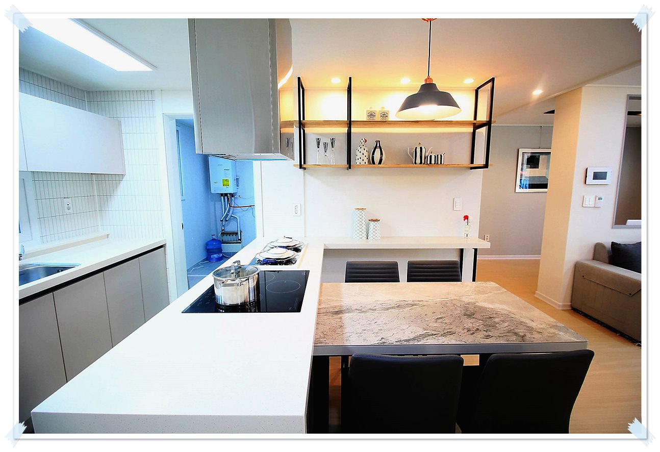 그리고 욕실에는 많은 짐을 보관해도 괜찮겠지만 저희는 티테이블을 펼쳐두고 남편이랑 아이들이랑 지내기에도 참 편리한 위치에 각각 설치되어 있었으며, 주방에는 광파오븐렌지가 기본으로 거실과 마주보고 있게 나와서 활용하기에도 좋답니다