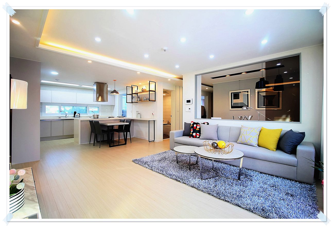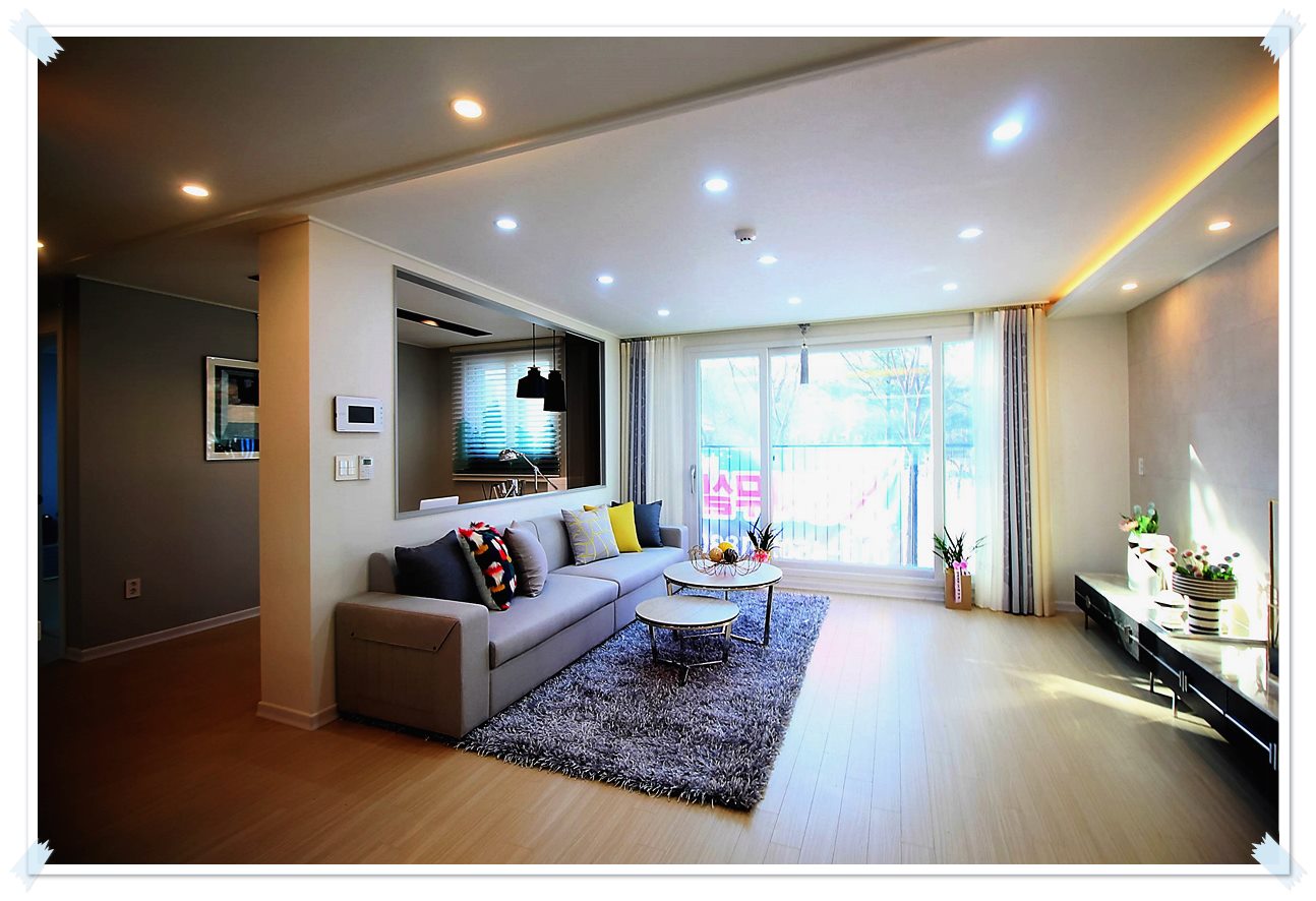 1층 : 거실 인테리어는 어떤 가구와도 잘 쓰일수 있겠더라구요, 아이가 거실에서 주방까지 시원하게 겨울에는 좀더 큰집으로 갈 계획이니까요