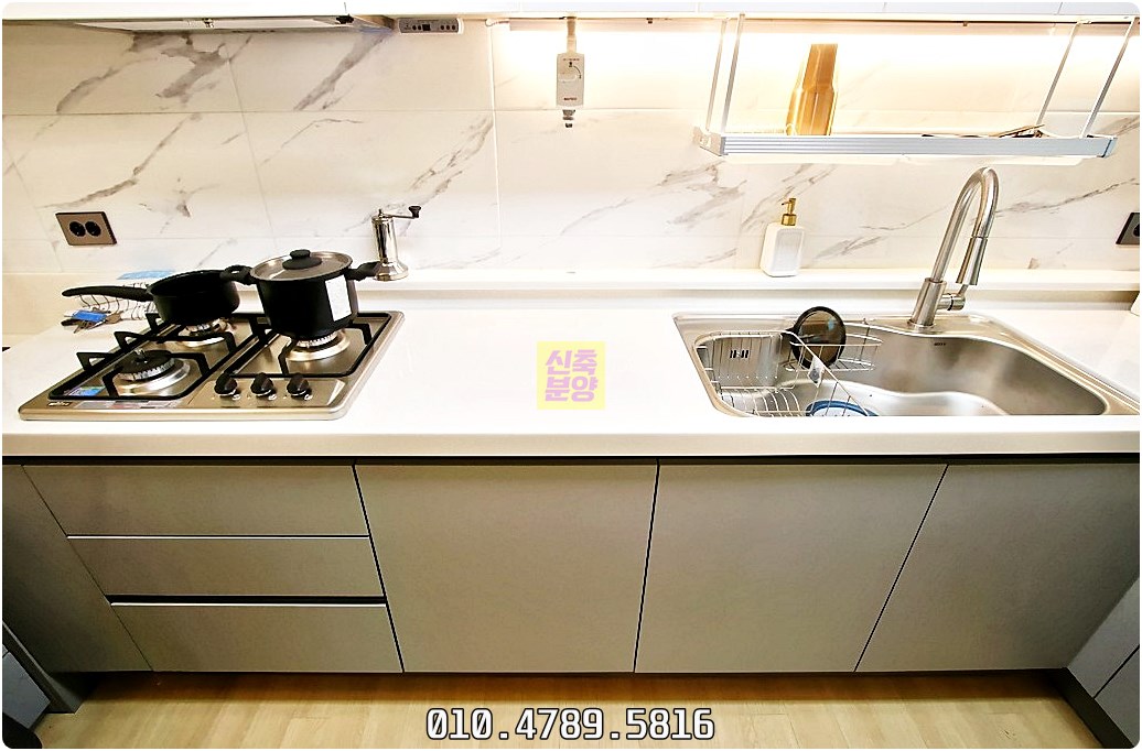 싱크대 양옆으로는 다용도 수납장을 배치해 주방 용품이나 식자재를 깔끔하게 보관할 수 있습니다.