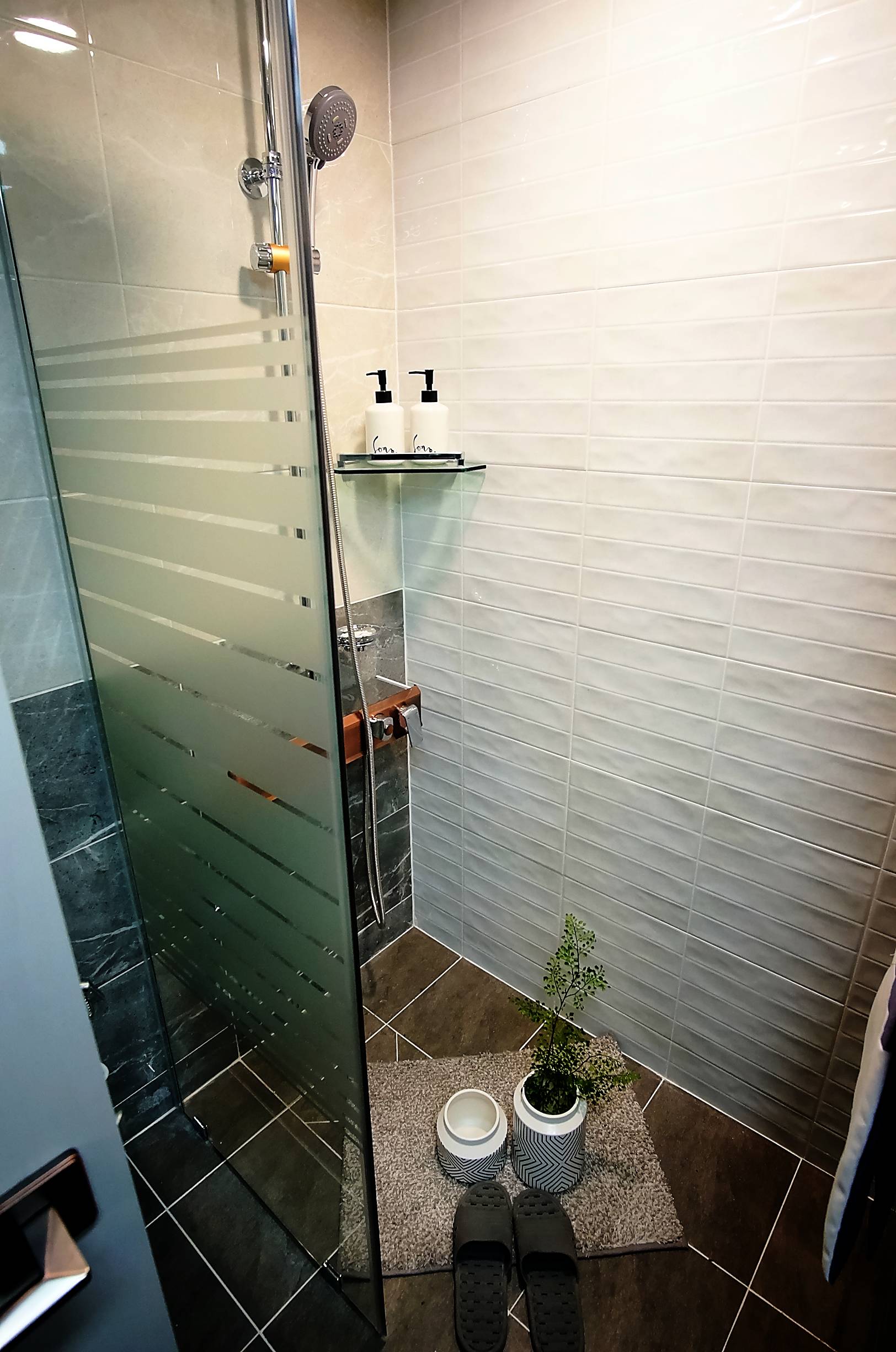 바닥재를 미끄럼 방지 기능이 들어간 타일이라 더욱 이쁜것같습니다.