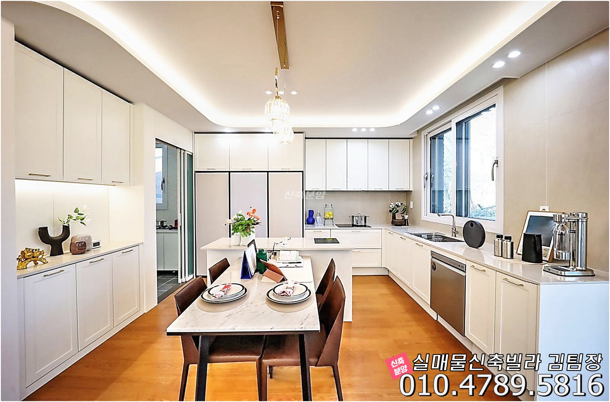 주방은 화이트 톤으로 정리해 요리와 식사의 시간을 밝게 만든다. 아일랜드와 넉넉한 식탁자리는 가족 동선의 중심이 되고, 보조주방은 대용량 조리·수납을 책임진다. LG 오브제 냉장고와 식기세척기가 기본 제공되어 초기 가전 세팅 부담을 낮춘다.